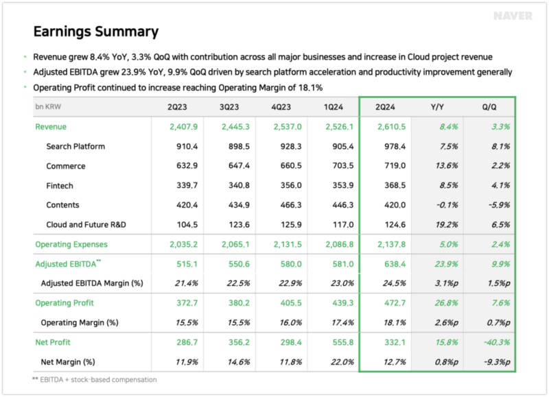 On August 9, Naver announced its Q2 2024 financial results, reporting revenue of KRW 2.61 trillion (USD 1.96 billion), adjusted EBITDA of KRW 638.4 billion (USD 478.8 million), and operating profit of KRW 472.7 billion (USD 354.6 million).
