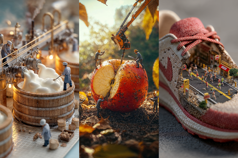 We’ve developed a unique “AI miniature” approach that combines AI image generation (Stable Diffusion, Midjourney, etc.) with advanced video production. We turn everyday objects into vast landscapes where tiny people live and work. Instead of just showing products or messages, we transform them into immersive experiences that deliver emotional narratives and visual delight simultaneously.