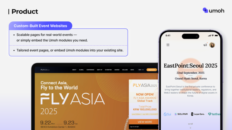 Our core product is Umoh, a B2B event operations SaaS platform consisting of three main modules: participant management and on-site operations, an AI business matching engine, and data analytics and marketing tools.