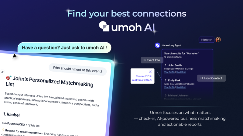 Enter Splab Inc., a Korean startup that’s transforming how business events create lasting value. Their flagship platform, Umoh, integrates AI-powered business matching with real-time event operations and comprehensive data analytics, turning one-time encounters into sustainable business opportunities. The platform has already been deployed at over 100 major B2B events across Korea, the United States, and Japan, including high-profile conferences hosted by AWS Korea, Nexon, Knowledge Graph Conference(NYC), KOOM(NYC) and various international venues.
