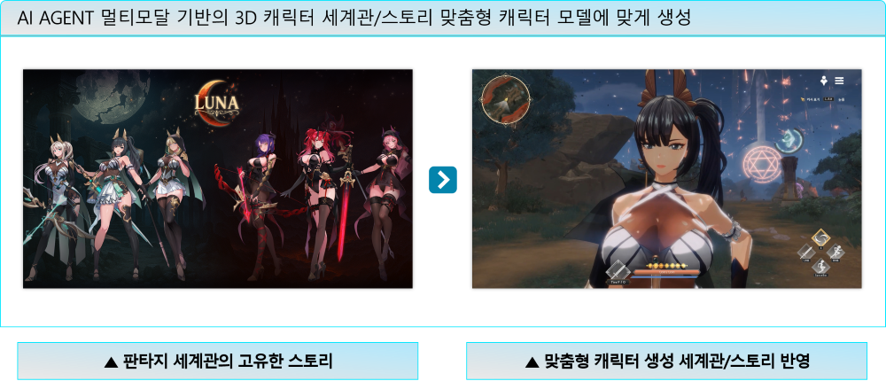 We’ve completed developing ‘UBIS AI AGENT,’ which automatically generates 3D characters within 115 hours with just 2D original artwork, utilizing AI technologies including deep learning and multimodal. Unlike when people work, 3D characters can now be produced in 5 days regardless of business days.